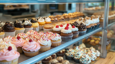 selection of classic and gourmet cupcakes on display at bakery, with customers enjoying the delicious treats, created with generative ai