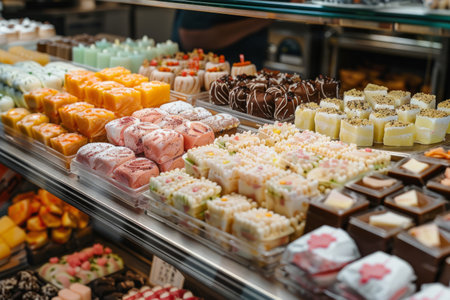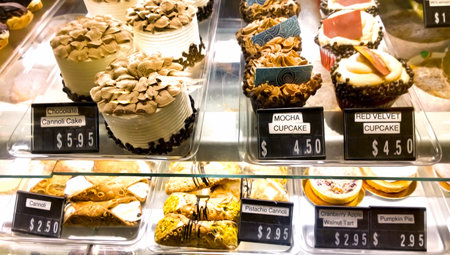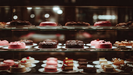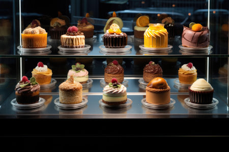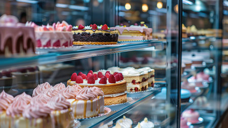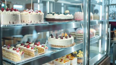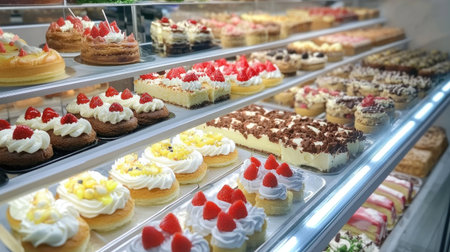 Assorted pastries and cakes are beautifully presented in the showcase of a bakery shop
