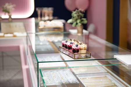 interior cafe shot, Showcase in a candy store. Glass stand with cake eclairs and tartlets. refrigerator shelves with sweets. Sweet pastries with berries. Pastel tones.