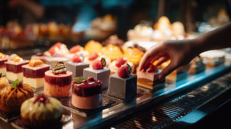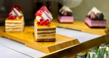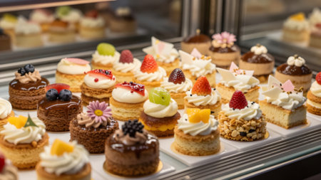 A stunning display of assorted pastries and cakes showcasing vibrant colors and enticing textures, perfect for any dessert lover or special occasion.