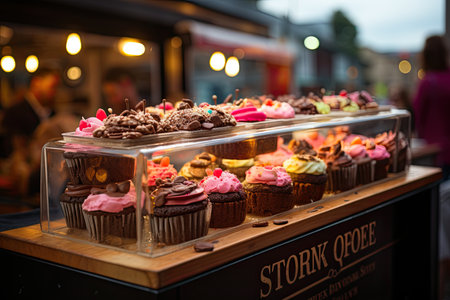 Cakes and sweets on the front of a small coffee shop, bokeh light background.