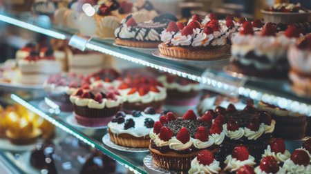 A variety of baked pastries displayed in a glass showcase in a bakery. The arrangement includes different tarts, cupcakes, and pies with toppings like berries and chocolate. Warm and inviting ambiance with soft lighting highlighting the intricate details of the desserts.