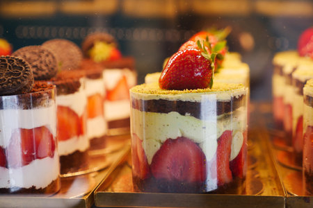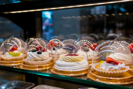 Pastry shop glass display with selection of cream or fruit cake, bakery shop with various flavors of cake