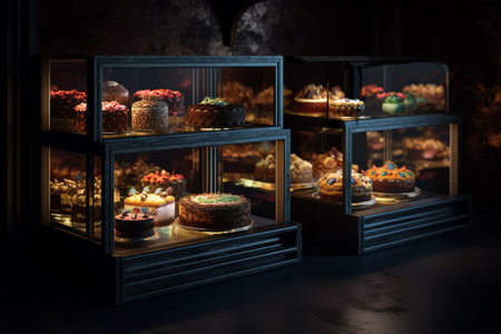 A modern bakery with various types of Desserts and cakes. A showcase with Cakes. Image for cafe menu, Banner