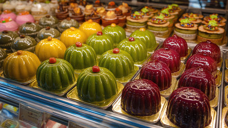 A vibrant array of Asian desserts showcases colorful jellies, delicate cakes, and creamy mousses in an inviting bakery display, perfect for sweet lovers.