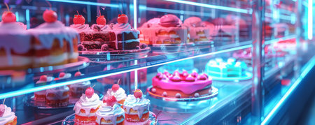 Hightech bakery with neonlit cakes and holographic displays, Scifi, Cool tones, Sharp focus, 3D illustration