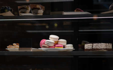 Showcase in a coffee shop, restaurant or pastry shop. Macaroons, eclairs, cake, tartlet with nuts, tiramisu.