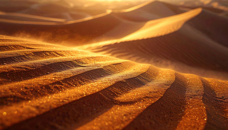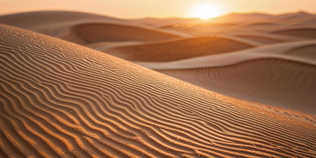 AI Generated. Closeup of Golden Sand Dune Ripples in Warm Sunset with Soft Shadows and Subtle Textures