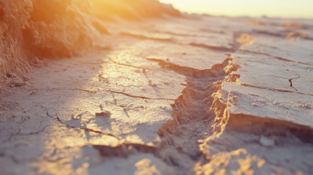 A close-up view of cracked earth illuminated by warm sunlight at sunrise, showcasing the beauty and desolation of the landscape. The textures and shadows create a serene atmosphere while highlighting the effects of erosion and climate.