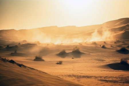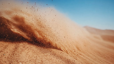 Experience the beauty of a desert landscape with dunes and dust particles swirling in the air, capturing the essence of nature's power and tranquility under a clear blue sky.