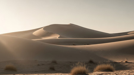Golden sand dunes with gentle curves under soft sunlight, featuring sparse dry grass and subtle shadows.