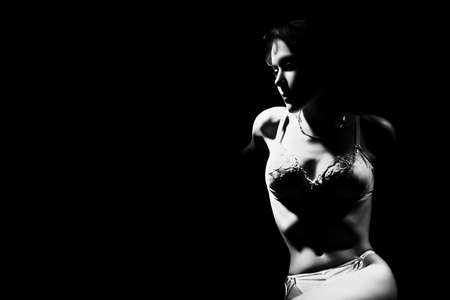 Sexy woman body in lingerie on black. Black and white sensual beautiful girl