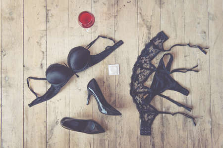 Top view of sexy black lingerie, high-heeled shoes and a condom on wooden background