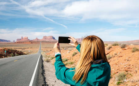 A woman tours the famous Monument Valley desert highway in Utah, USA.