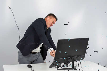 Caucasian man in a suit gets angry and smashes the keyboard on the monitor. An office worker in a rage breaks the computer.
