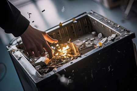 An AI generated human hand grasping a small piece of metal from a broken cardboard box
