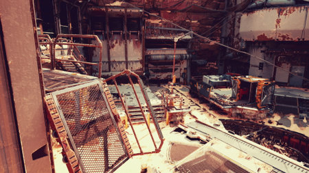 This scene showcases an eerie abandoned factory, with rusted machinery and broken equipment scattered throughout. Sunlight streams through cracked windows, revealing forgotten remnants of the past.