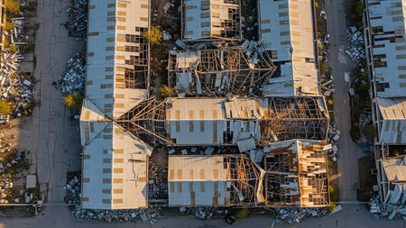 An overhead drone view of a destroyed industrial facility. Collapsed roofs, exposed metal structures, and scattered rubble indicate significant damage and neglect.