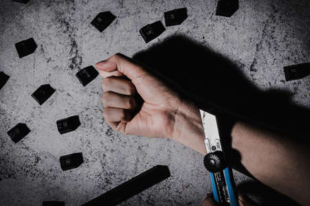 Destroying computer hard drive with a hammer. Removing important data.
