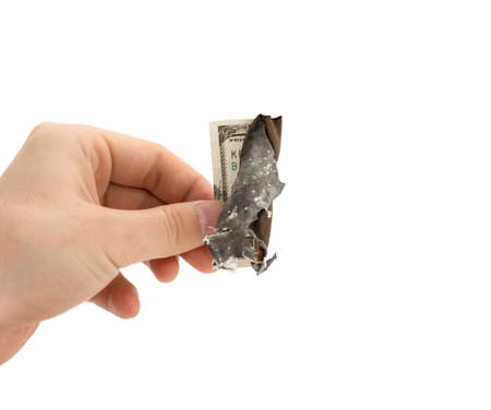 Close-up of a man's hands holding burning cash, maybe a US dollar note.