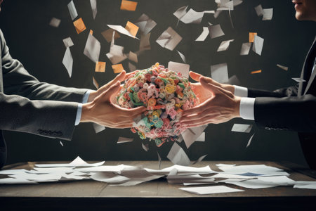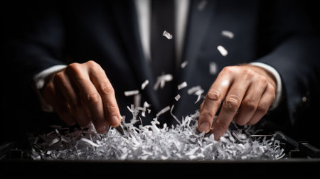 A hand gracefully releases fragmented paper shreds in an organized office space, symbolizing the transition from chaos to clarity in work environments.
