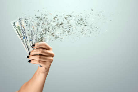 A hand holds a hundred dollar bills that dissolve into thin air. The concept of big expenses, loans, mortgages, big purchases