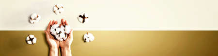 Female hands holding cotton flowers - flat lay