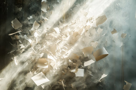 A white paper explosion with a lot of white paper flying everywhere. The paper is scattered all over the room