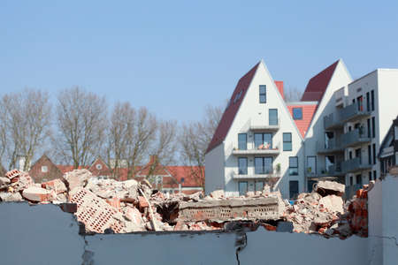 Debris from a demolition house, modern residential buildings in the background