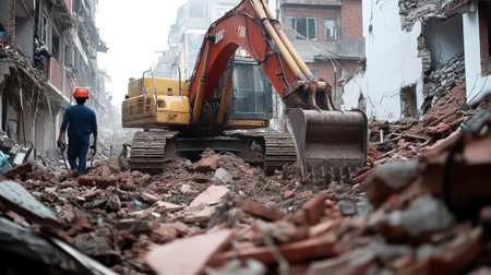 Demolition site of a city building by an excavator