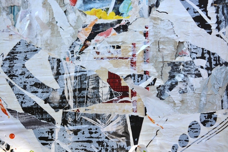 Old grunge ripped torn collage posters creased crumpled paper placard texture background with copy space for text or image