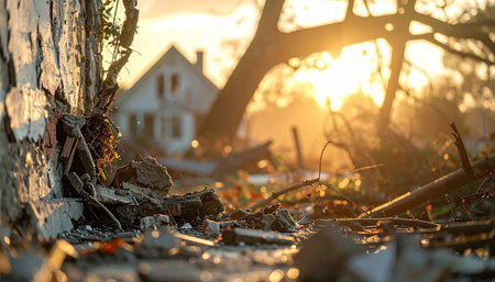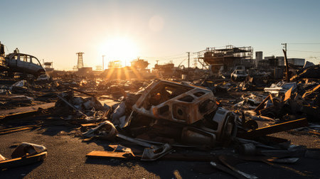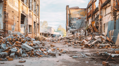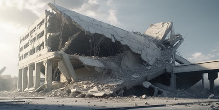 AI Generated. Strike causes destruction to industrial concrete building Scene of disaster with debris dust and collapsed structures under rising sun and blue sky