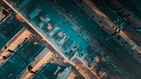 Aerial view of demolition site. Process of demolition of old industrial building.