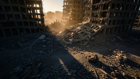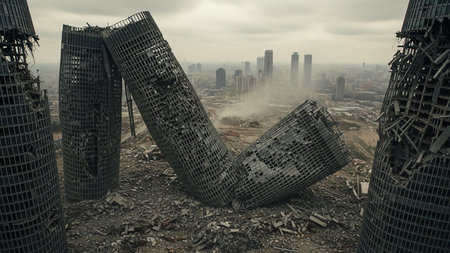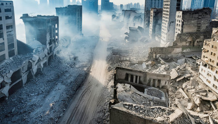 Desolate urban landscape filled with collapsed structures and debris in a post-apocalyptic city ruins scene after a catastrophic war. AI-generated content