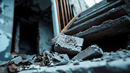 A close-up of concrete rubble and broken stairs in a derelict building, evoking themes of urban decay, disaster, and abandonment with a somber, desaturated color palette.