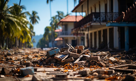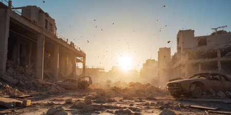 Buildings showing devastated cityscape with collapsed buildings rubble and a damaged car under harsh sunlight. resolution use.