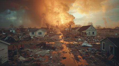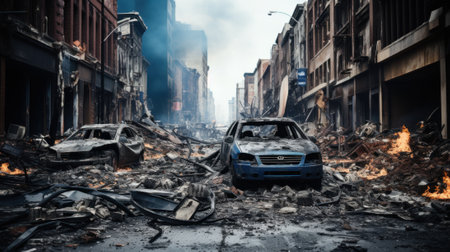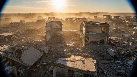 AI Generated. Devastated urban cityscape covered in dust and rubble after a massive destruction event