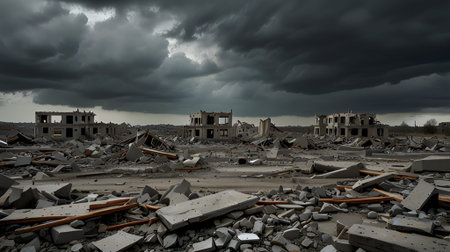 A desolate war-torn landscape with ruined buildings, rubble, and a dark stormy sky, depicting the aftermath of destruction and tragedy.