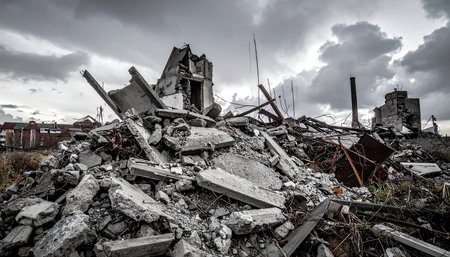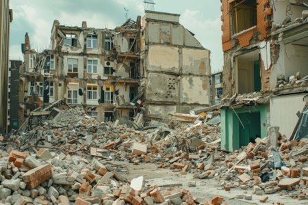 Decay showing pile of rubble and debris from a destroyed building under a cloudy sky keywords: rubble, debris,...