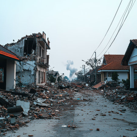 Abandoned Urban Landscape After Natural Disaster with Ruined Buildings and Smoke Rising, Symbolizing Destruction and Loss in a Devastated Area