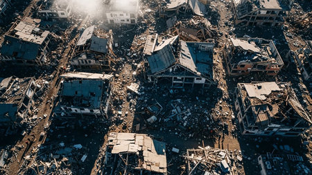 After showing aerial view of devastated city blocks showing widespread destruction and rubble after a catastrophic event. resolution