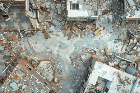 Industrial showing overhead drone view of a chaotic pile of rubble and debris from a demolished building, with sharp shadows keywords: rubble, debris, demolition,...