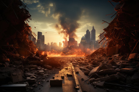 Illustration of a city destroyed by bombs, the effects of war. generative AI