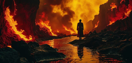 A man emanates a warm, glowing light with volcanic textures across his body. The background features a mystical landscape filled with ash and glowing embers, creating an otherworldly atmosphere.