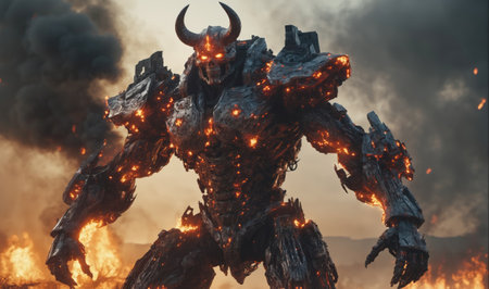 A fiery, demonic robot stands amidst a backdrop of smoke and fire