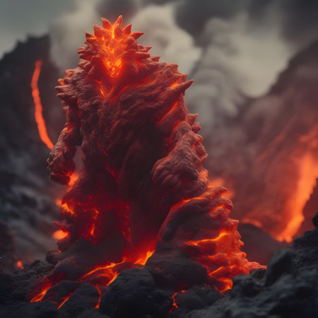 A captivating close-up of a dark stone creature featuring vibrant orange lava cracks and glowing fiery eyes, evoking a powerful and mythical presence.