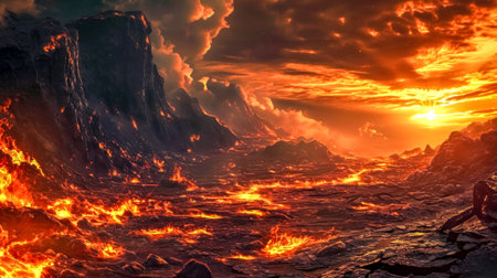 hell. Apocalyptic vision of a fiery landscape, with molten lava and a blazing sky at sunset