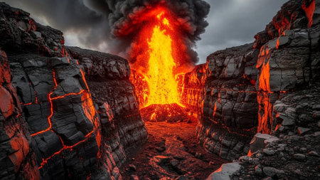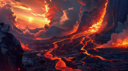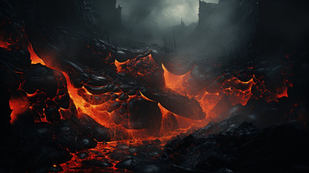 A Dramatic volcanic lava flow with glowing red and black textures creates mesmerizing and intense natural scene