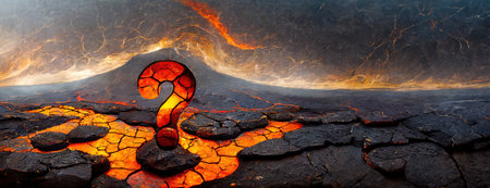 Artistic rendering of a volcanic landscape with a question mark. Illustration combines a lava field and inquisitive symbol, suggesting mystery and exploration..