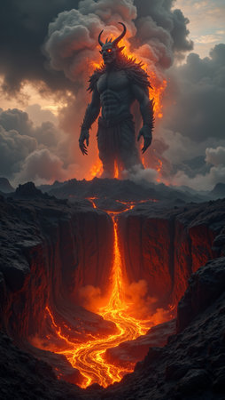 A towering figure made of volcanic rock displays glowing orange cracks, surrounded by a dramatic twilight landscape filled with smoke and distant lava flows.